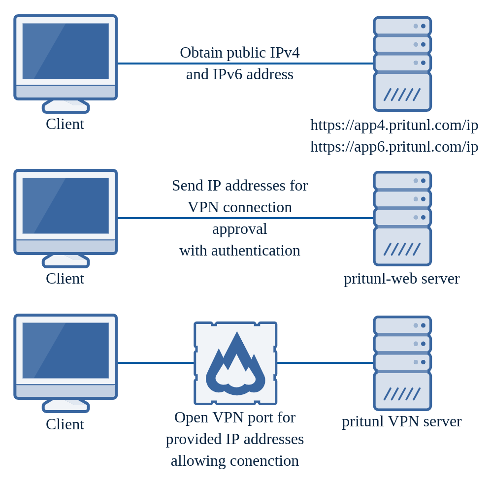 Once the Pritunl server validates the connection approval request the server will open the VPN port for the requested server to the client IP addresses. Three sources are used to determine the client IP address, the client provided IPv4 and IPv6 address discovered from the Pritunl app servers and the remote address of the incoming web request on the Pritunl server.