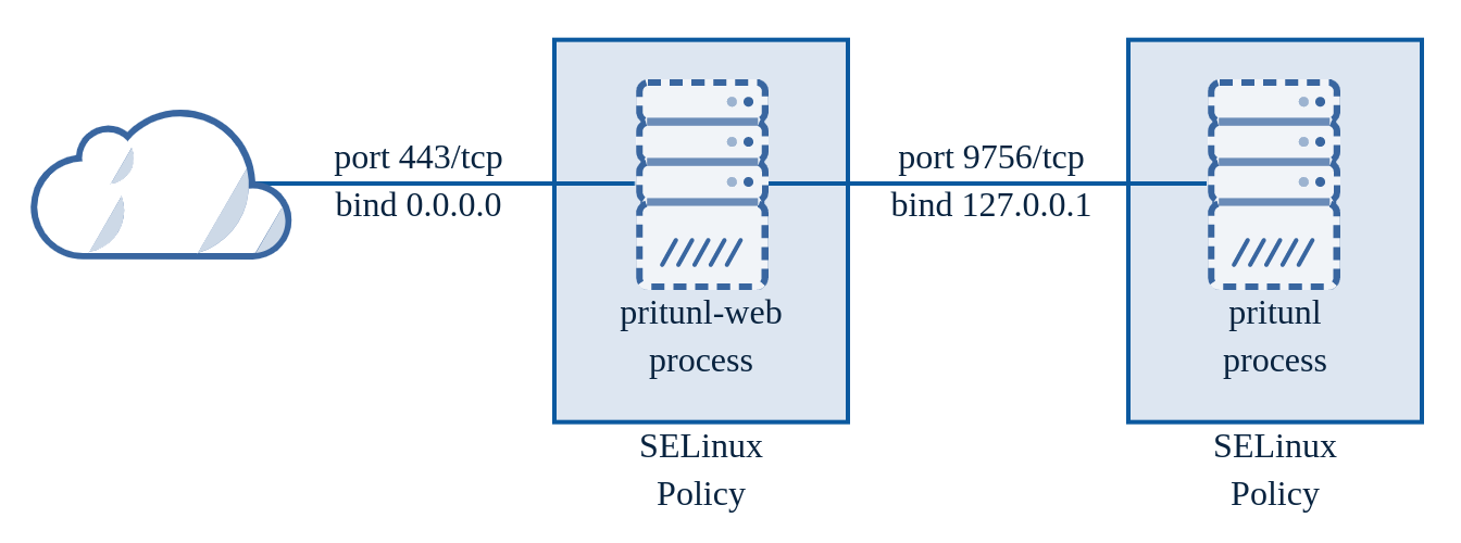 The pritunl-web process is a Golang web server that will handle SSL and validate the incoming data. The Golang web server has a very good history of security and this isolation provides a high level of protection from RCE attacks. Additionally on RHEL distributions SELinux policies are included with the pritunl package that will significantly limit the capabilities of the pritunl-web process providing additional protection from RCE attacks. Every web handler and the JSON data structure for that handler is statically defined in pritunl-web. This prevents unexpected types or data structures from reaching the internal Python process.